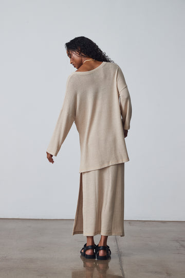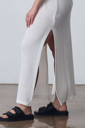 Regular price $100.00Regular priceUnit price / perSale price $100.00High double slit open weave knit skirt, with elastic waistband.