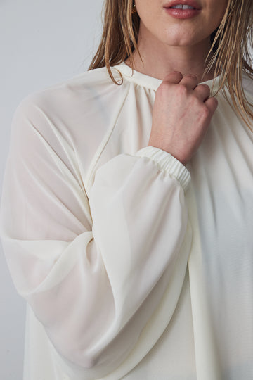 Regular price $200.00Regular priceUnit price / perSale price $200.00Mock neck double-layered chiffon with back button enclosure.