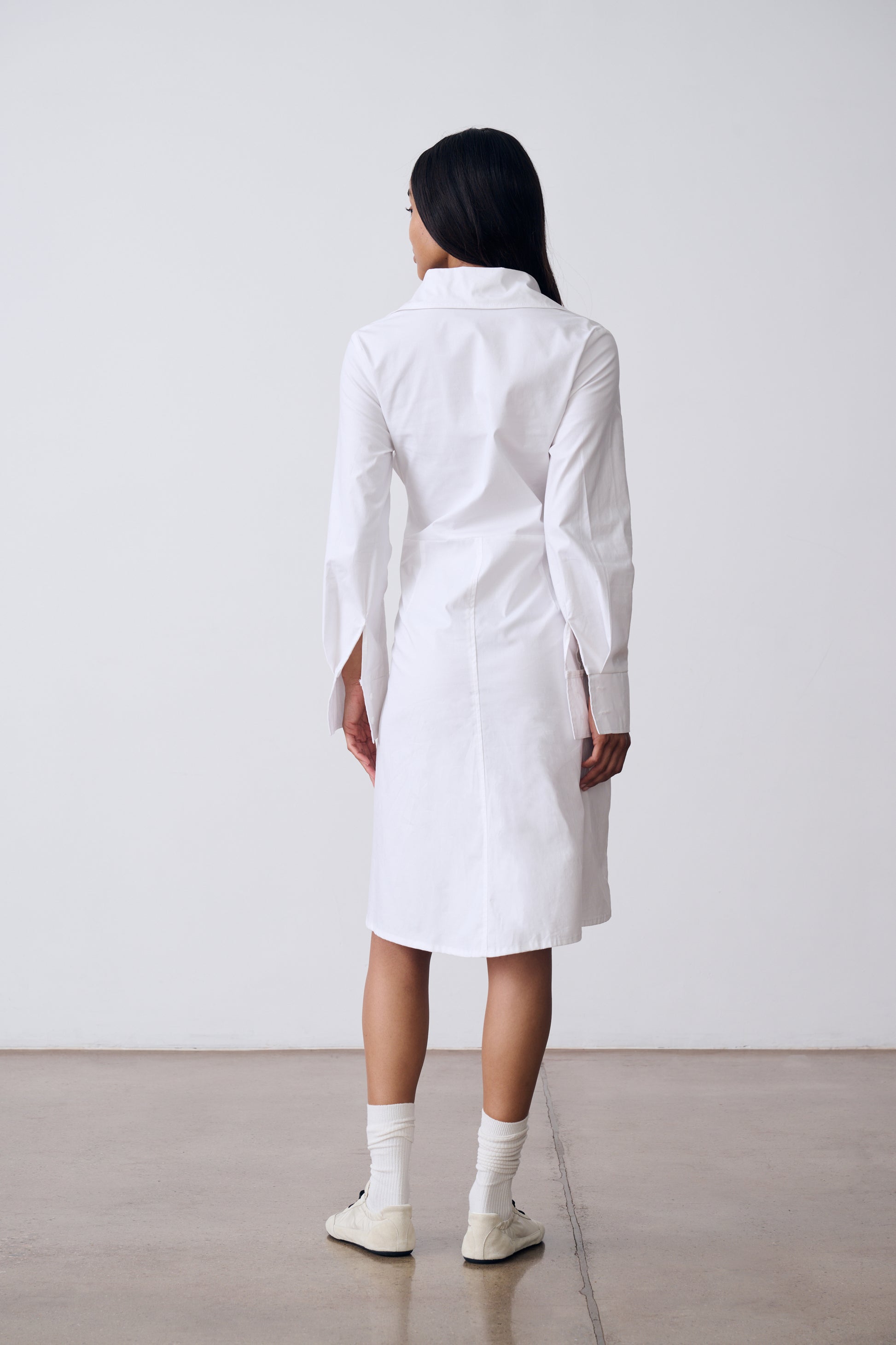 Cotton button down dress with exaggerated lapels and faux sleeve belt at waist. In ivory color.